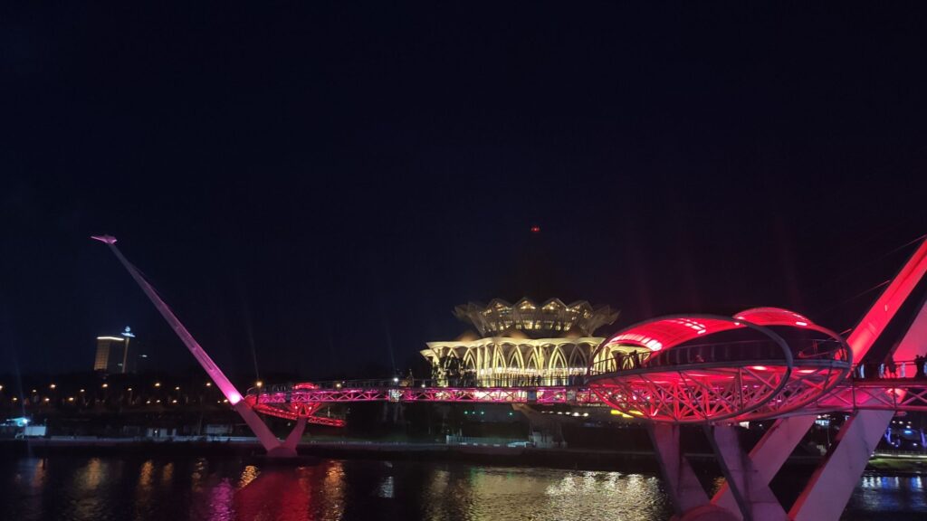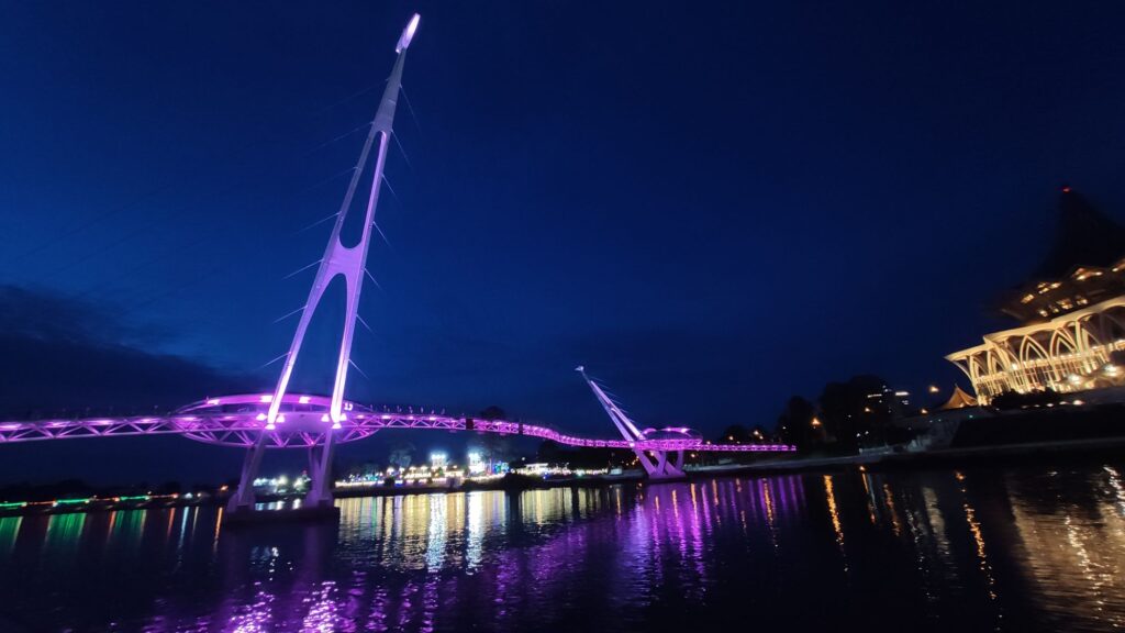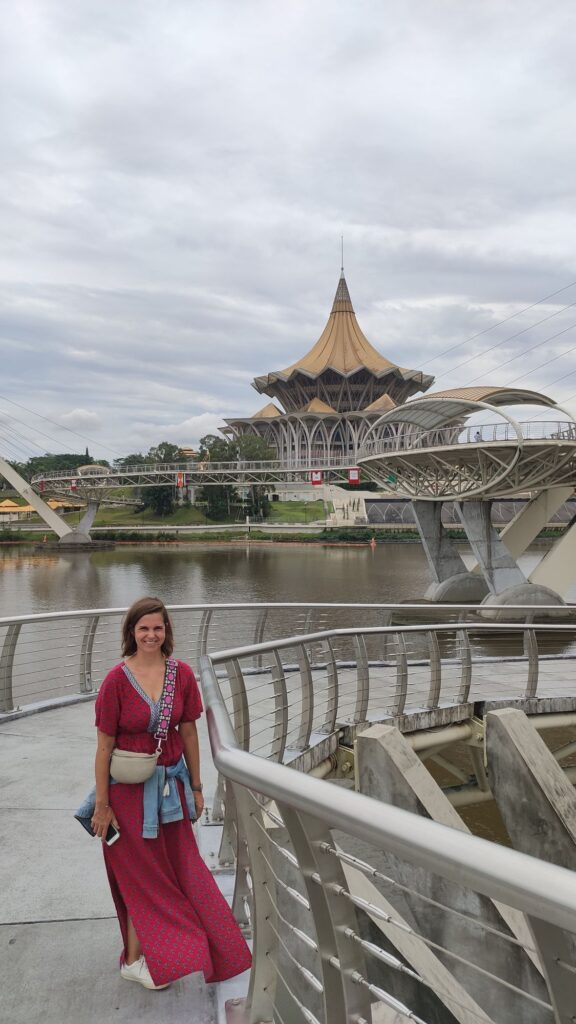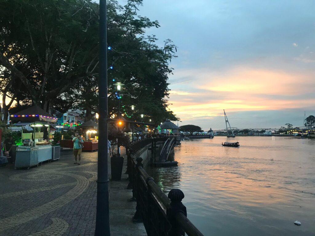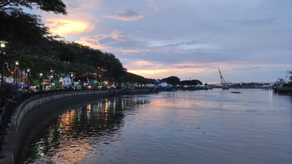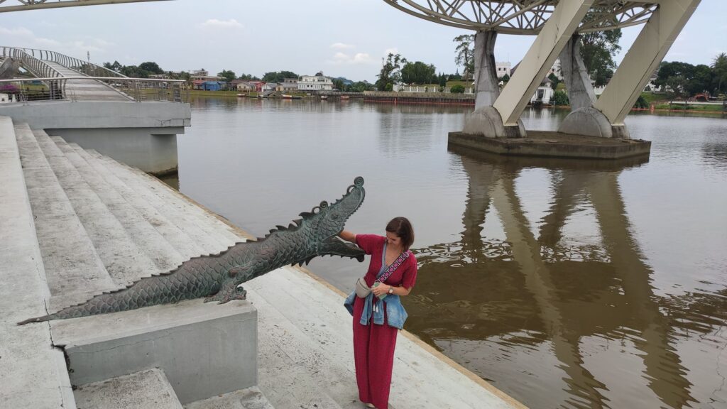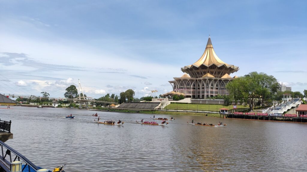 Kuching liegt nicht direkt am Meer, sondern etwas im Landesinneren am Sarawak River, an dessen Ufer sich eine ausgedehnte Promenade befindet – die Waterfront. Hier hat man einen tollen Ausblick auf das Parlamentsgebäude von Sarawak und die futuristisch anmutende “Darul Hana Bridge”. Am späten Nachmittag erwacht die Waterfront dann richtig zum Leben – zahlreiche, teils mobile Streetfood-Stände nehmen ihren Betrieb auf, es gibt Livemusik und Straßenkünstler (in Comic-Helden-Outfits tanzende Menschen). Wir haben das große Glück, dass genau während unseres Aufenthaltes die alljährliche große Drachenboot-Regatta stattfindet, in dem Mannschaften aus 16 Ländern gegeneinander antreten. Begleitet wird dieses von einem großen Art- und Food-Festival, für welches zusätzlich hunderte kleine Stände in Zelten an der Waterfront aufgebaut wurden.