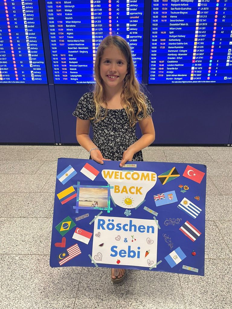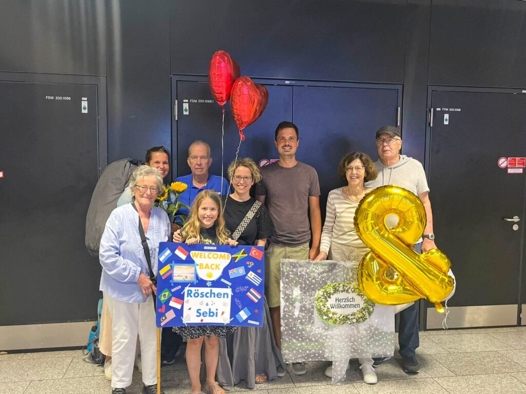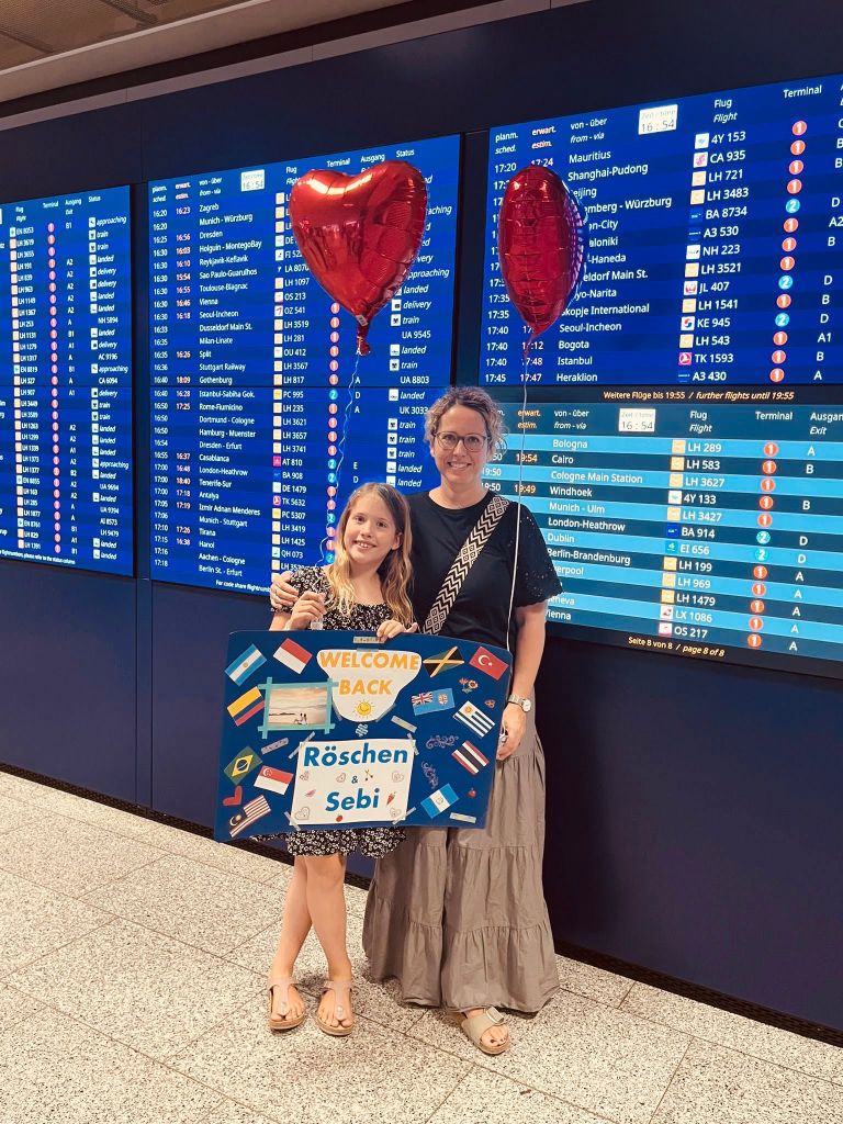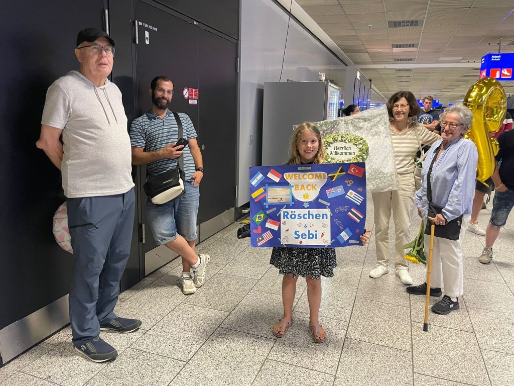 Unsere Ankunft in Frankfurt (und später auch in Berlin) war ein wirklich wunderbares Erlebnis! Wir wurden von unseren Familien mit einem großen Hurra, selbst gebastelten Schildern, verschiedenen Luftballons und einer unbeschreiblichen Freude empfangen! Es ist schön, zu erfahren, dass Menschen zuhause auf einen warten und sich freuen, uns wiederzusehen! Trotz einer Verzögerung bei der Gepäckausgabe von knapp zwei Stunden halten alle, ob jung ob alt, die Stellung vor der Ankunftshalle! Und dann wurden wir von Tina und Jan auch gleich noch gemeinsam mit allen anderen zum Grillen eingeladen. Ein wirklich traumhafter Empfang in Deutschland 🙂