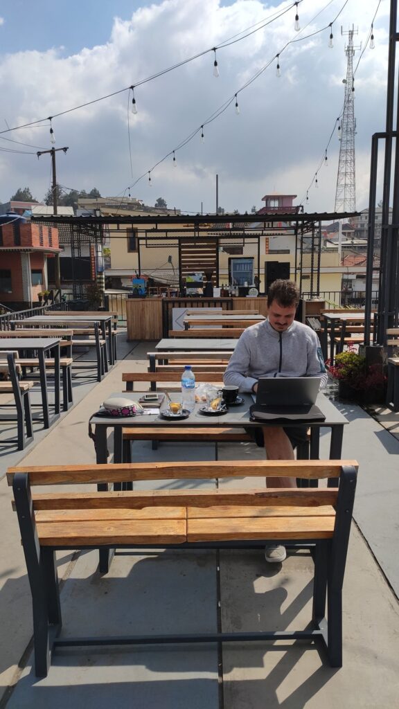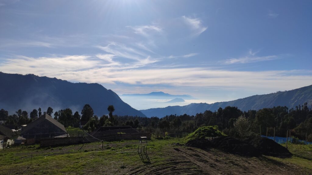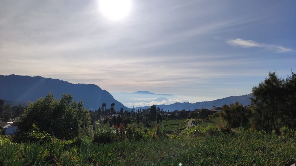 Ansonsten gibt es hier nicht sehr viel zu tun, selbst Wanderwege scheint es außer dem Weg zum Bromo und zum Viewpoint nicht zu geben. Daher nutzen wir die Zeit und holen einige aufgeschobene Tagebucheinträge und Blog-Artikel im Sonnenschein auf dem Rooftop eines netten Cafés mit Blick auf die schönen Berge nach 🙂
