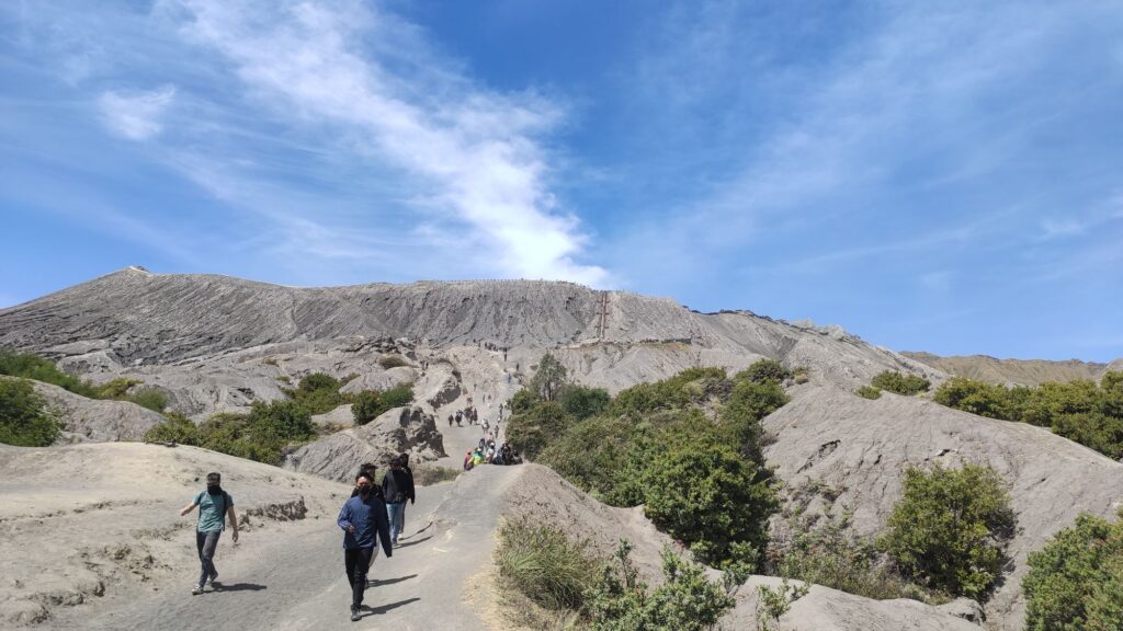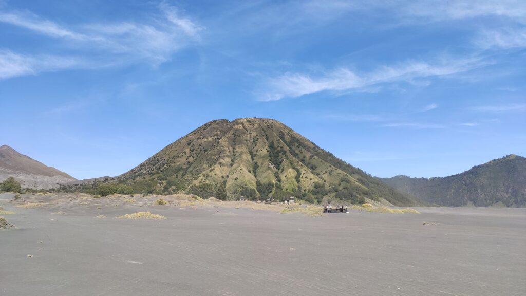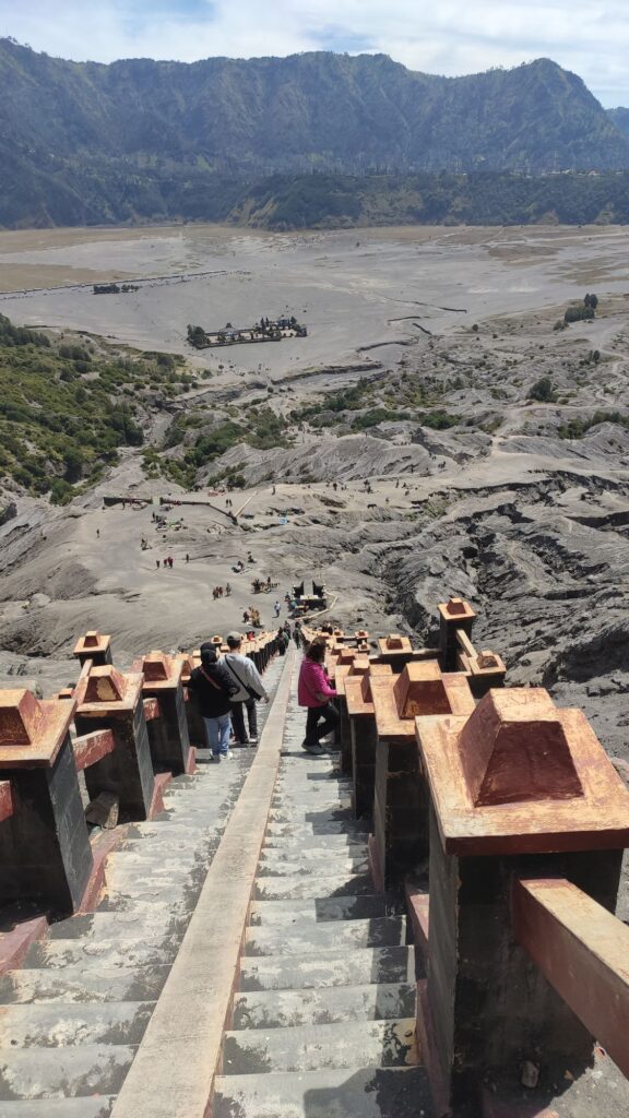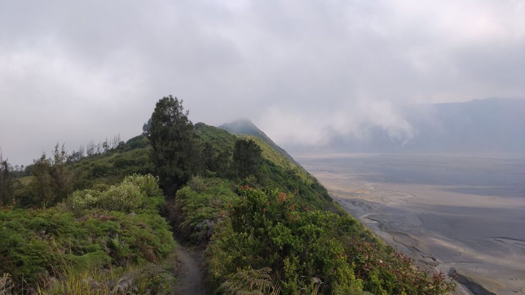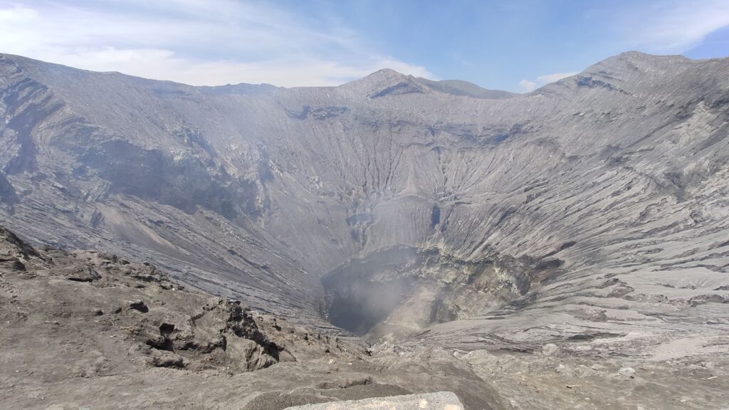 Die Nachtfahrt mit Bus & PKW hierher war überraschend angenehm, daher machen wir uns direkt am Morgen der Ankunft, noch bevor wir unser Zimmer beziehen können, auf den Weg zum Hauptziel unseres Aufenthalts. Der Mount Bromo gilt als einer der aktivsten Vulkane des Landes und liegt nur eine knappe Stunde Fußmarsch vom Dorf entfernt. Glücklicherweise können wir uns sogar den Eintritt sparen, da dieser wohl nur am ganz frühen Morgen erhoben wird. Wir steigen zunächst vom äußeren Kraterrand herab und erreichen bald den “Sea of Sand”, eine sehr weitläufige Fläche aus sehr feinem schwarzem und hellem Sand. Die meisten Touristen durchqueren das Gebiet in Jeeps oder teilweise auch auf Rollern. Für uns total unnötig, wir haben ja Zeit und benötigen für die Durchquerung bis zum Aufgang zum Bromo höchstens 20-30 Minuten. Der Aufstieg zum eigentlichen Vulkankrater wird nochmal etwas anstrengender, ist aber gut ausgebaut und für den steilsten Abschnitt gibt es sogar eine komfortable Treppe. Kaum oben angekommen, empfängt uns schon der intensive Schwefelgeruch des Ungetüms, begleitet von einem tiefen, fast unheimlichen Brummeln, das ansatzweise die Kraft erahnen lässt, die sich hier unter der Erdoberfläche aufbäumt. Rein optisch macht der Bromo allerdings einen sanften Eindruck. Der Kraterboden ist von Sand bedeckt, aus dem gleichmäßig in ruhigem Tempo Rauchschwaden aufsteigen. Den vielleicht 50 cm breiten Trampelpfad um den Bromo herum ignorieren wir, genau wie auch alle anderen Touristen, die sich zeitgleich mit uns am Vulkan aufhalten. Die sicherlich mit 60-70° abfallenden Hänge auf beiden Seiten des Weges flößen uns doch gehörigen Respekt ein. Der große grüne Vulkan auf den Bildern ist übrigens der inaktive Mount Batok. Sicherlich sind wir nicht die Ersten und nicht die Letzten, die ihn auf Grund seines deutlich imposanteren Aussehens zunächst für den Mount Bromo gehalten haben.