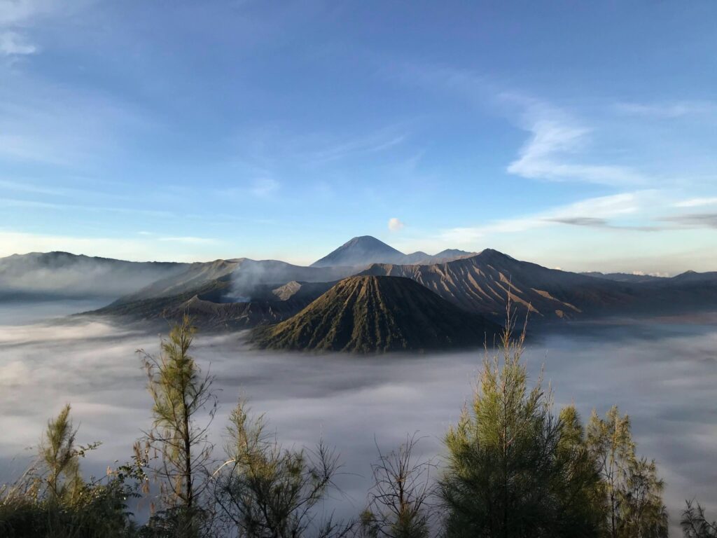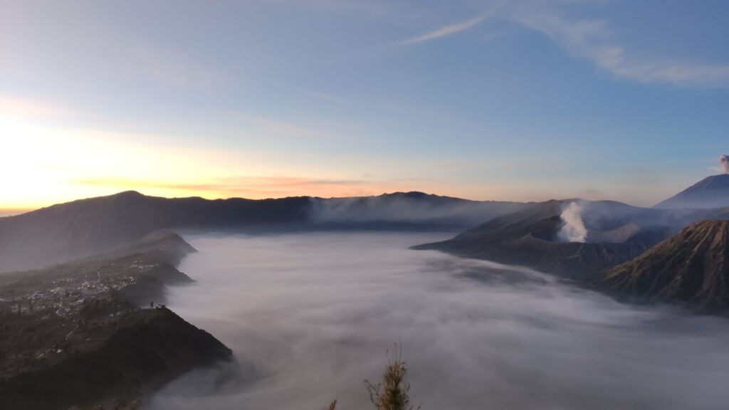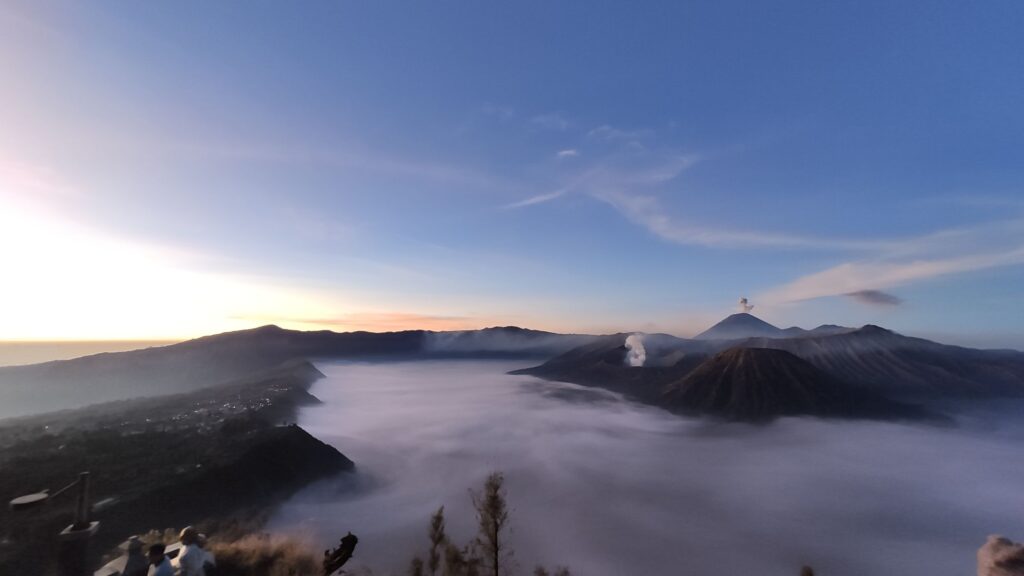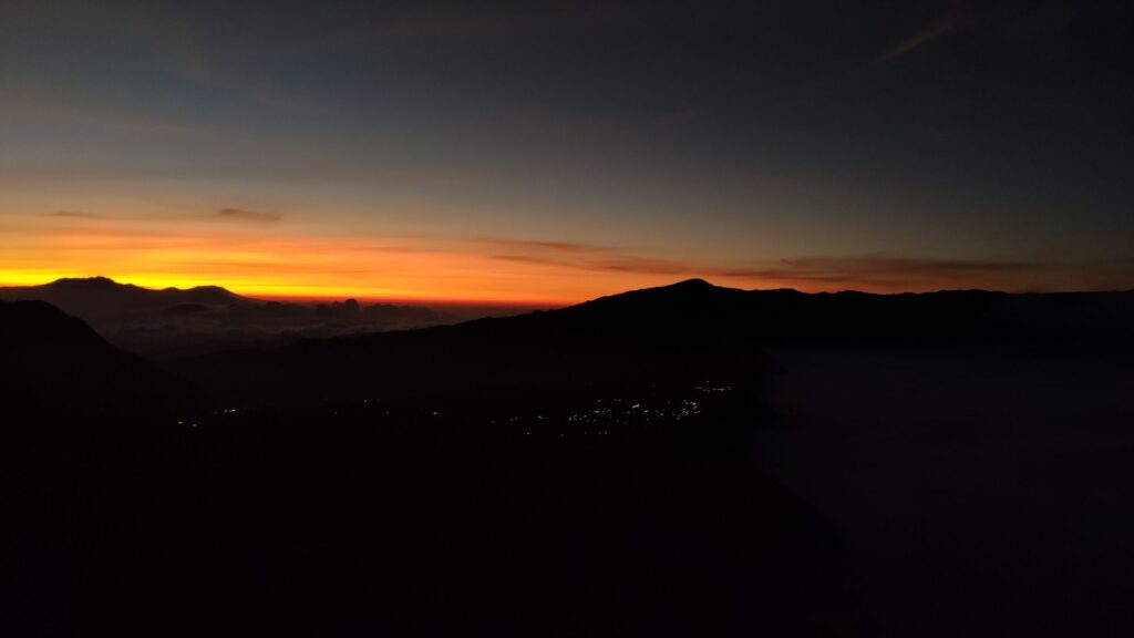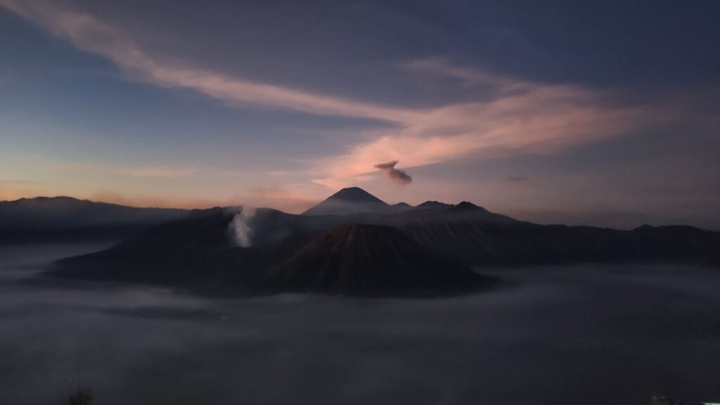 Am nächsten Morgen klingelt pünktlich um 02:50Uhr der Wecker – Zeit sich warm anzuziehen und sich auf den Weg zum Sunrise Viewpoint zu machen, der in den frühen Morgenstunden einen herrlichen Blick auf das Vulkangebiet bieten soll. Der Weg ist nicht so lang, wird aber immer steiler, sodass wir gegen Ende doch deutlich außer Atem kommen. Nach einer guten Stunde Fußmarsch erreichen wir genau rechtzeitig den Aussichtspunkt. Gerade zeigt sich der erste dünne gelb-rote Steifen am Horizont. Das frühe Aufstehen hat sich auf jeden Fall gelohnt! Die frühe Morgensonne wirft ein wunderbares Licht auf die Vulkane. Das “Sea of Sand” ist von einer dünnen Nebelschicht bedeckt, was dem Anblick noch zusätzlich etwas Besonderes verleiht. Frohen Herzens machen wir uns an den Abstieg und suchen dann doch noch einmal unser Bett für ein kurzes Nickerchen auf 🙂