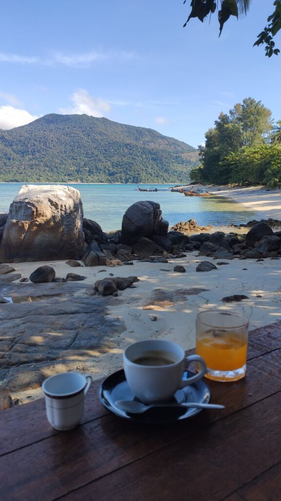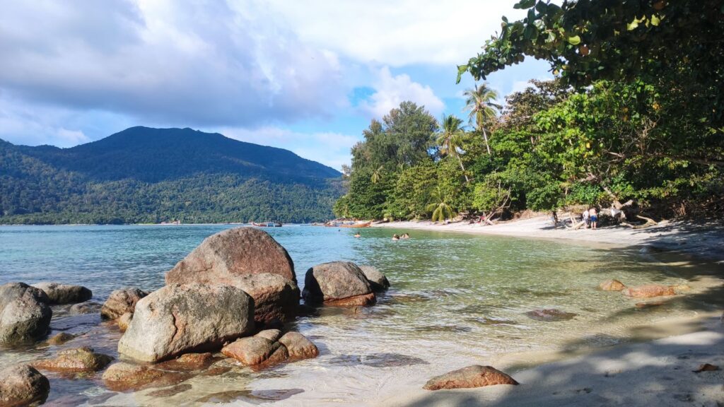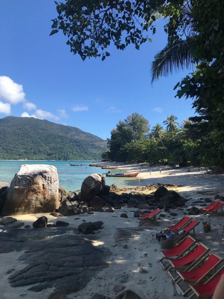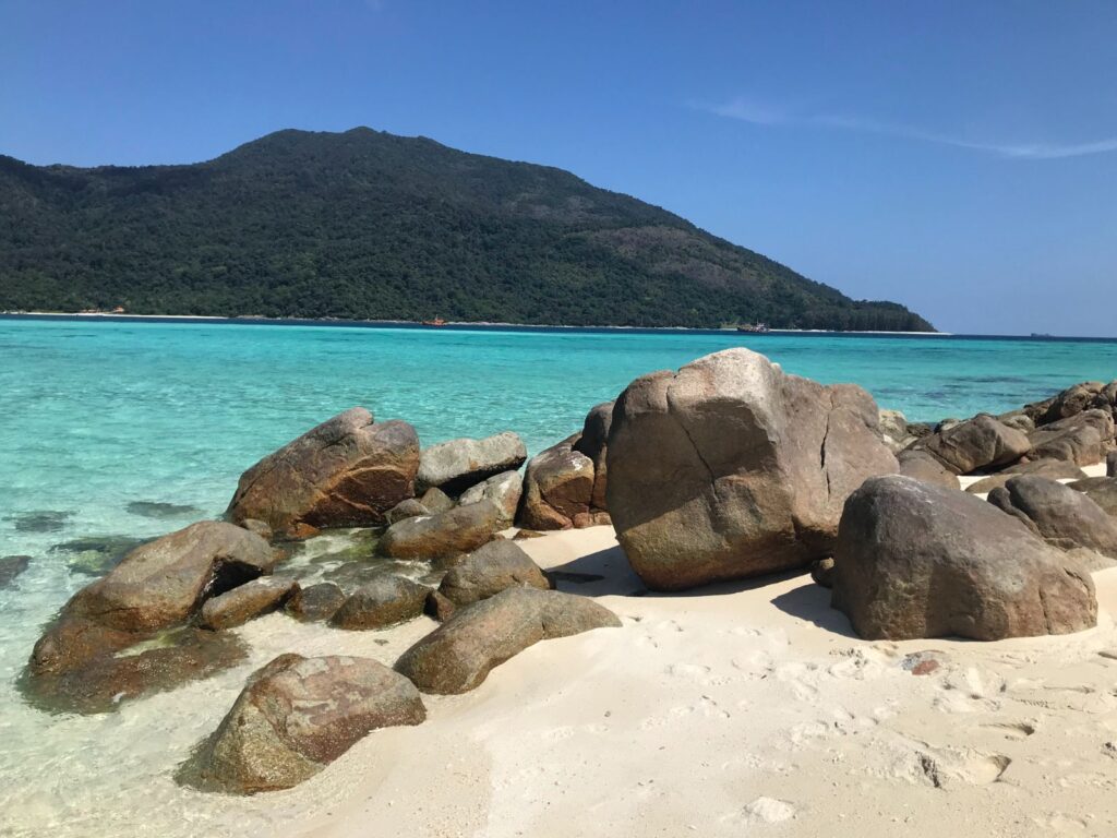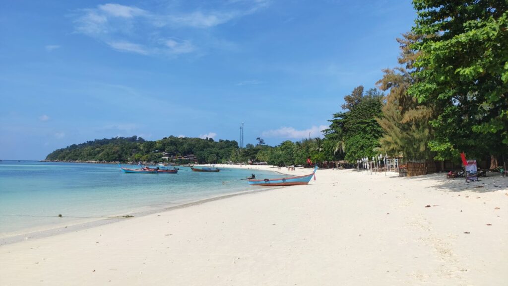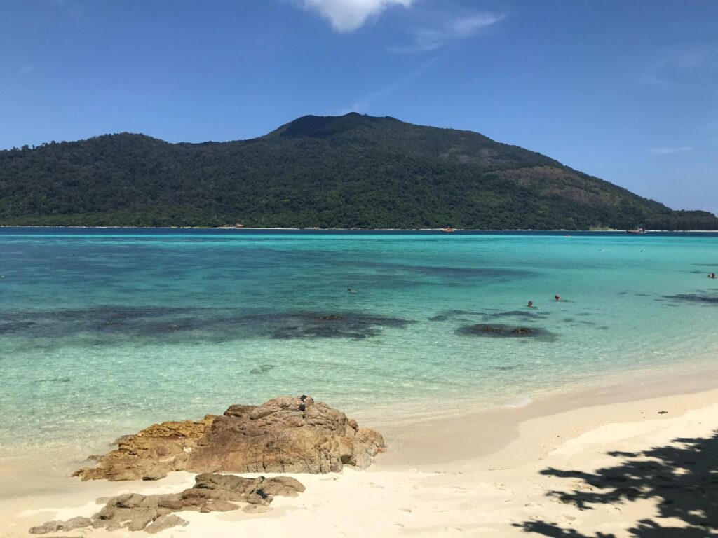 Obwohl wir in unseren vorhergehenden Urlauben schon viel in Südost-Asien herum gekommen sind, fehlt uns, bis auf einen kurzen Stop-over in Bangkok, der Klassiker Thailand noch vollkommen in unserem Erfahrungsschatz. Wir freuen uns auf besseres Wetter (in Malaysia hat es fast jeden Tag mehr oder weniger kräftig geregnet), leckeres Essen und neue kulturelle Eindrücke. Auf der winzigen Insel Koh Lipe ganz im Süden Thailands finden wir… nun ja, zumindest schon einmal Ersteres 🙂 Als hätten wir mit dem Grenzübertritt eine magische Barriere überschritten, ist der Regen wie verschwunden und wir erleben pure Sonne bei strahlend blauem Himmel. Ansonsten ist Koh Lipe eigentlich wie erwartet – sehr touristisch und leider etwas überlaufen. Es hat dafür aber schöne Strände, eine gute Infrastruktur und wir haben eine sehr schöne Unterkunft! Durch eine glückliche Fügung liegt unser Hostel sogar an dem mit Abstand schönsten Strand der Insel: Sunset Beach. Die übrigen Strände waren leider mit Holzbooten so zugestellt, dass es einen nicht wirklich gereizt hat, dort ins Wasser zu springen.