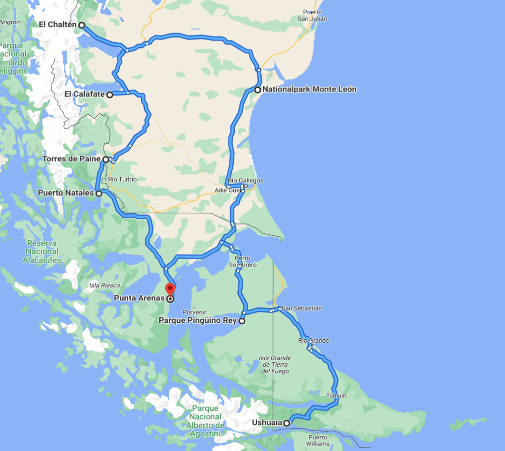 Nach einer eintägigen Fahrt durch sehr karge und öde Landschaften erreichen wir die Atlantikküste, die allerdings touristisch dann doch recht wenig zu bieten hat. Im Nationalpark Monte León sehen wir immerhin, ganz tiergerecht aus der Ferne, eine riesige Population Magellanpinguine. Von hier aus geht es direkt weiter nach Feuerland. Nach einem Zwischenstopp im Parque Pingüino Rey, in dem knapp 100 Königspinguine leben, zieht es uns in die südlichste Stadt der Welt: Ushuaia. Hier besuchen wir unter anderem den Parque Nacional Tierra del Fuego, in dem auch das südlichste Postamt der Welt jeden Morgen seine Türen öffnet 🙂 Von hier aus geht es mit nächtlichem Zwischenstopp an der Magellanstraße schon wieder zurück nach Punta Arenas, wo wir nach 19 Tagen unseren Pick-Up wohlbehalten wieder abliefern.