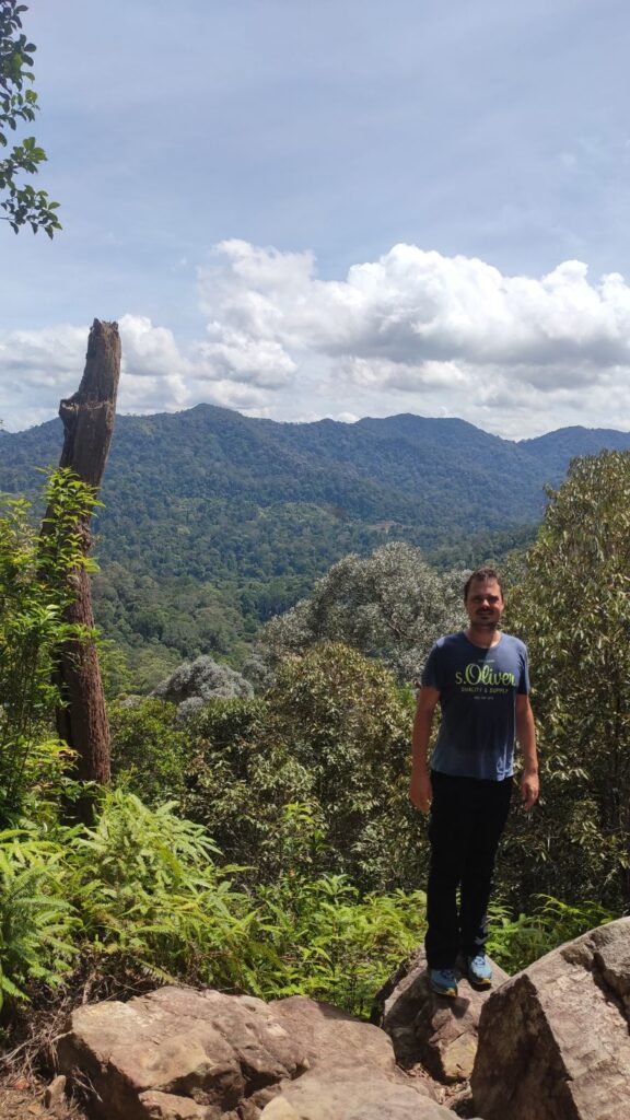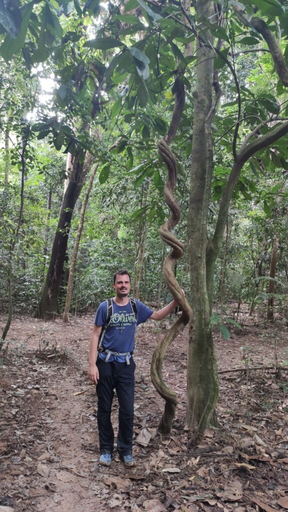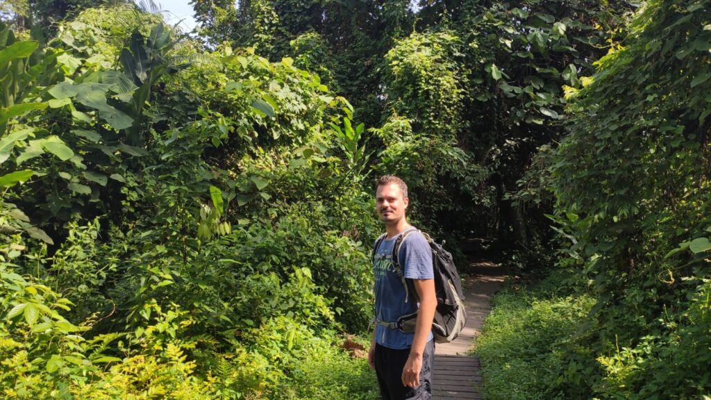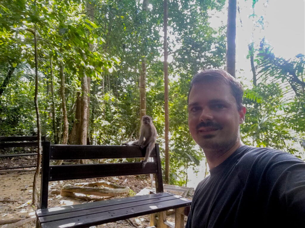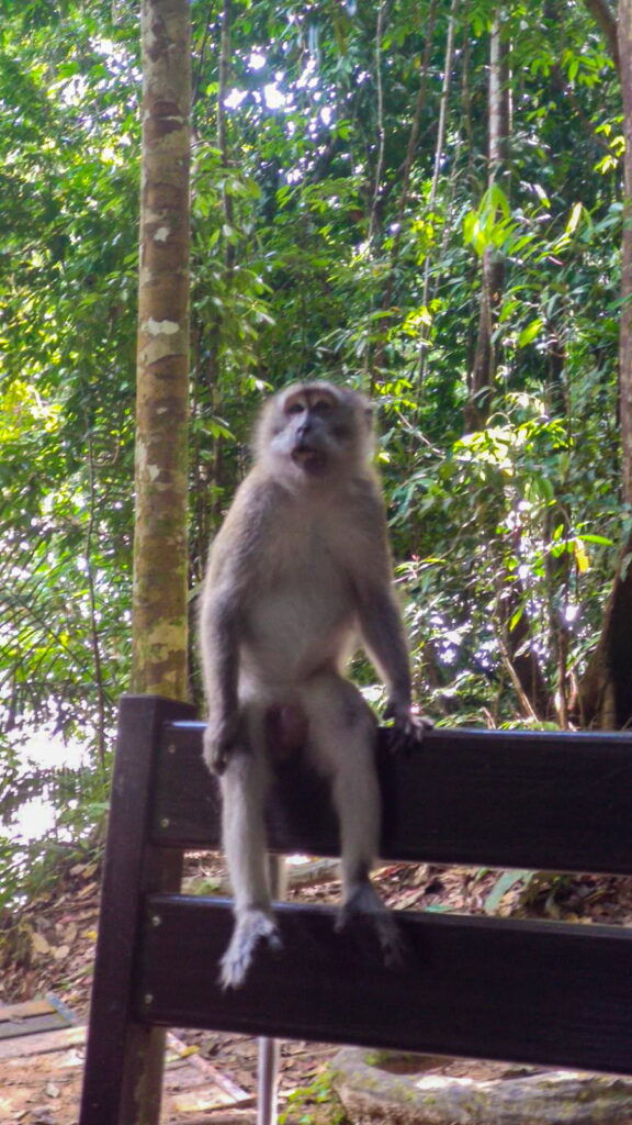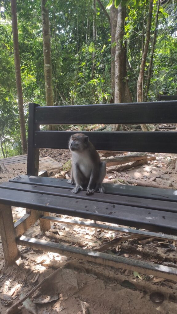 Die einzige Option für den zweiten Tag ist, die Bootsfahrt zu einem Wasserfall zu buchen – eine der wenigen Aktivitäten, die auch in der Regenzeit angeboten wird. Am Nachmittag machen wir uns dann noch einmal zu einer kurzen Wanderung auf einem der offiziell gesperrten Wege auf. Bei einer kleinen Pause auf dem Heimweg zieht überraschenderweise eine Gruppe Affen an uns vorbei. Eines der Männchen scheint im Gegensatz zu seinen Artgenossen, die mit deutlichem Abstand in den Baumwipfeln bleiben, kaum Angst vor Menschen zu haben und setzt sich auf die Bank zwei Meter gegenüber der unsrigen und spielt “Sitzen wie ein Mensch”, bis er nach ein paar Minuten das Interesse an uns verliert 😉