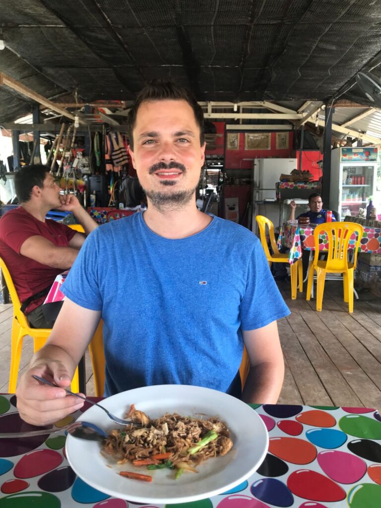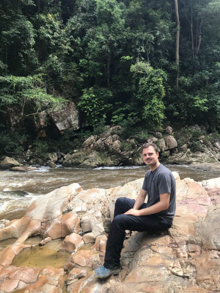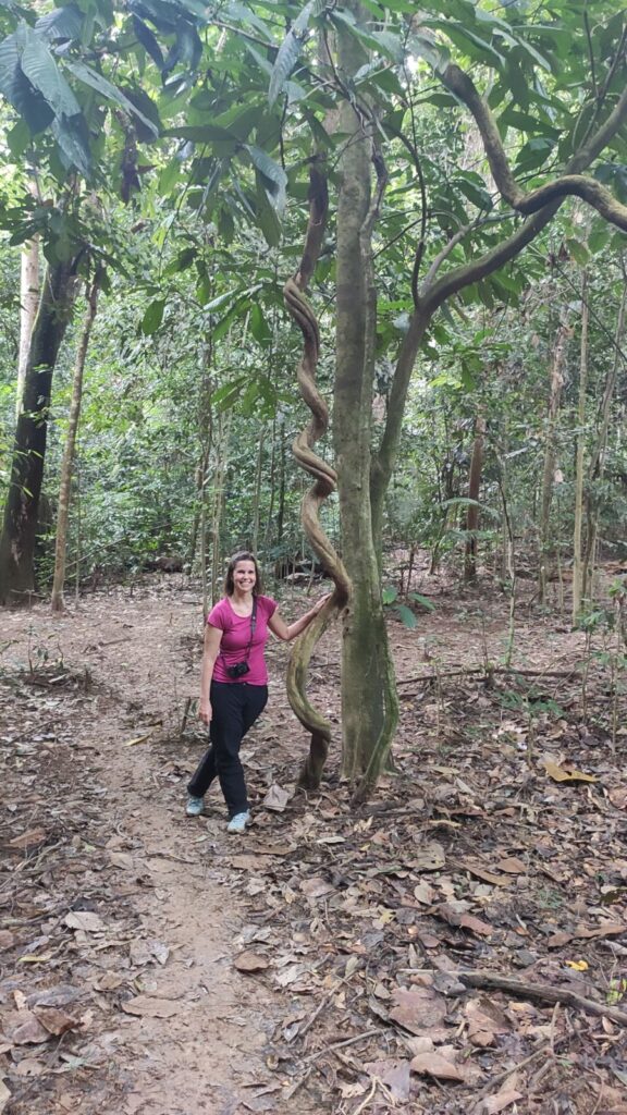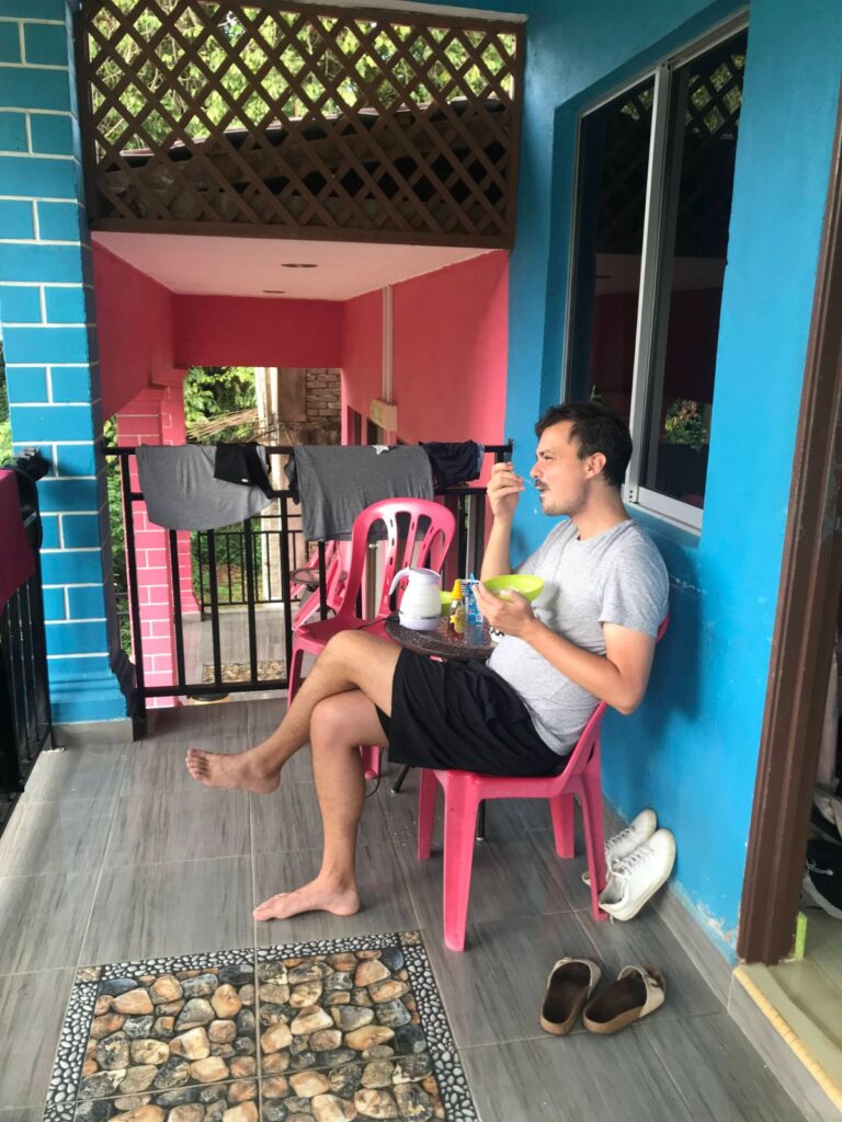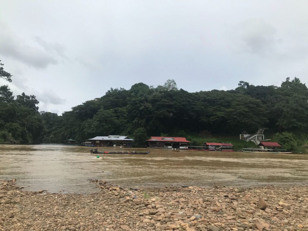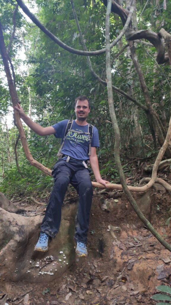 Die einzige Option für den zweiten Tag ist, die Bootsfahrt zu einem Wasserfall zu buchen – eine der wenigen Aktivitäten, die auch in der Regenzeit angeboten wird. Am Nachmittag machen wir uns dann noch einmal zu einer kurzen Wanderung auf einem der offiziell gesperrten Wege auf. Bei einer kleinen Pause auf dem Heimweg zieht überraschenderweise eine Gruppe Affen an uns vorbei. Eines der Männchen scheint im Gegensatz zu seinen Artgenossen, die mit deutlichem Abstand in den Baumwipfeln bleiben, kaum Angst vor Menschen zu haben und setzt sich auf die Bank zwei Meter gegenüber der unsrigen und spielt “Sitzen wie ein Mensch”, bis er nach ein paar Minuten das Interesse an uns verliert 😉