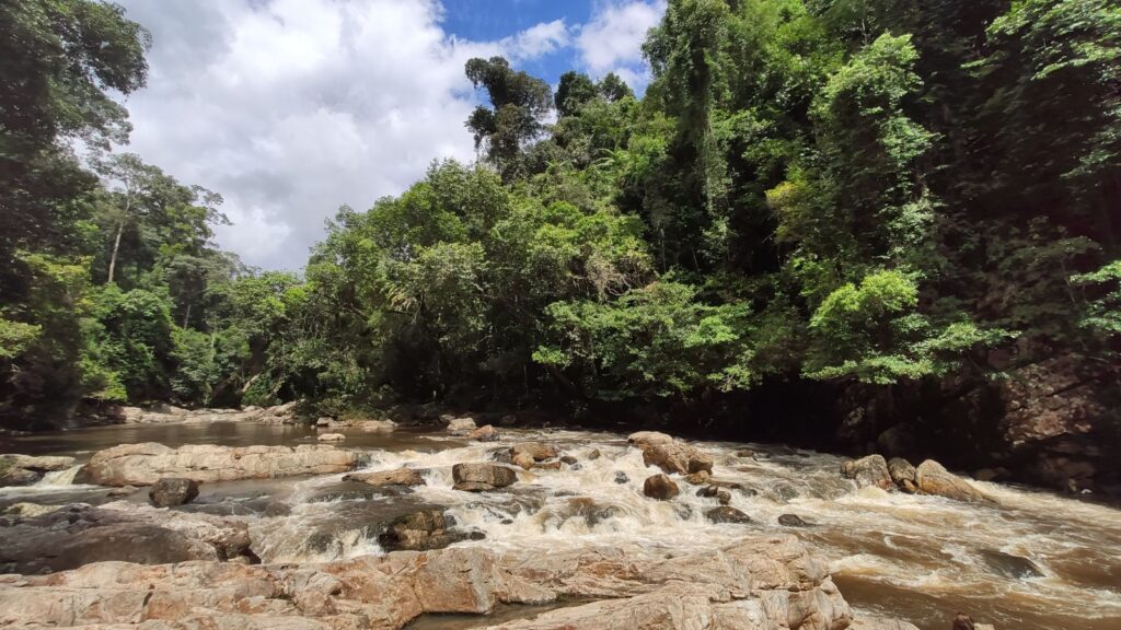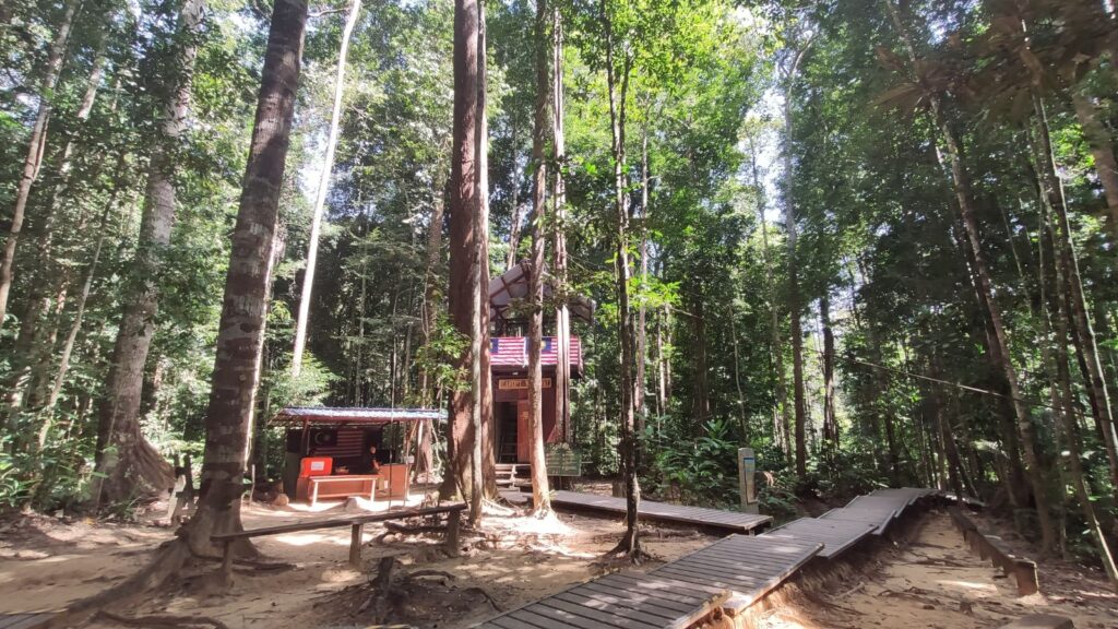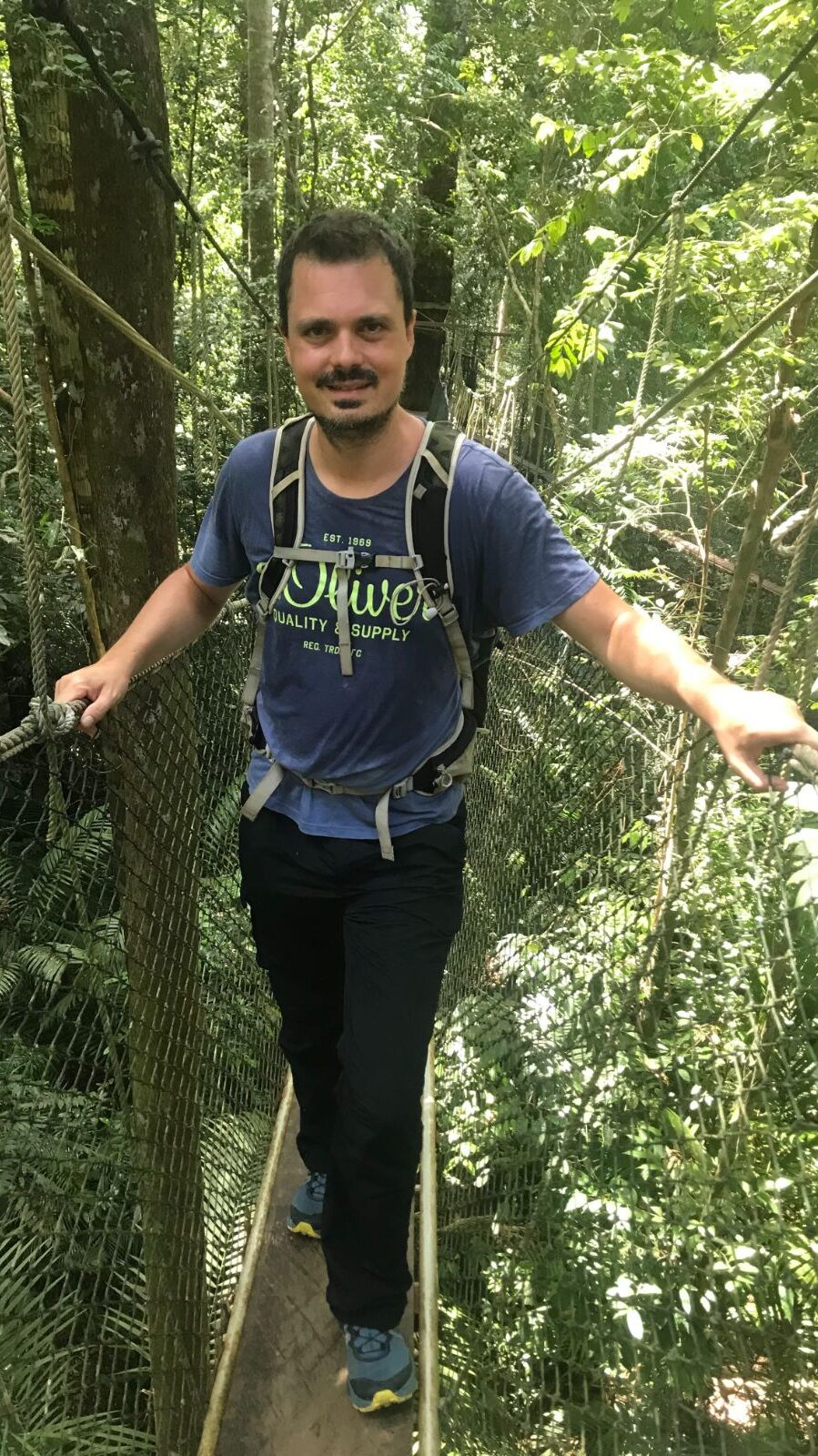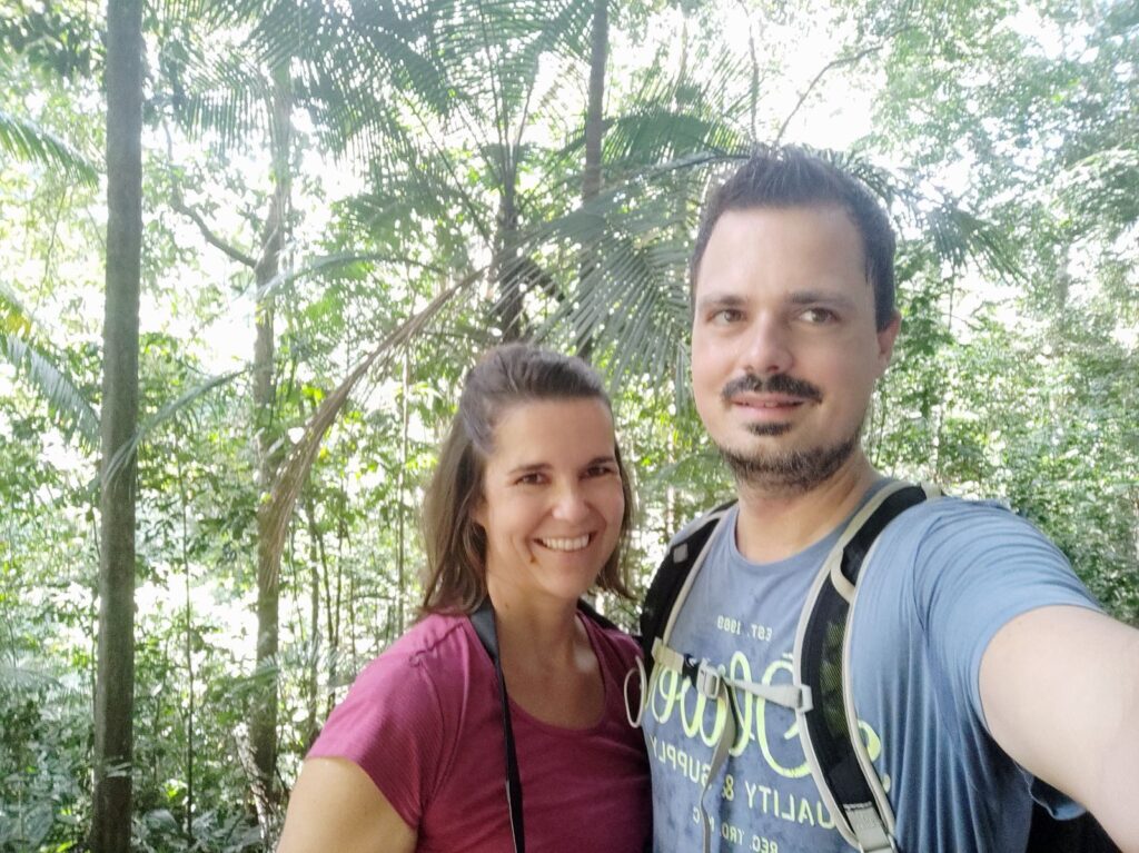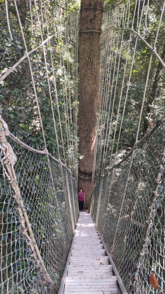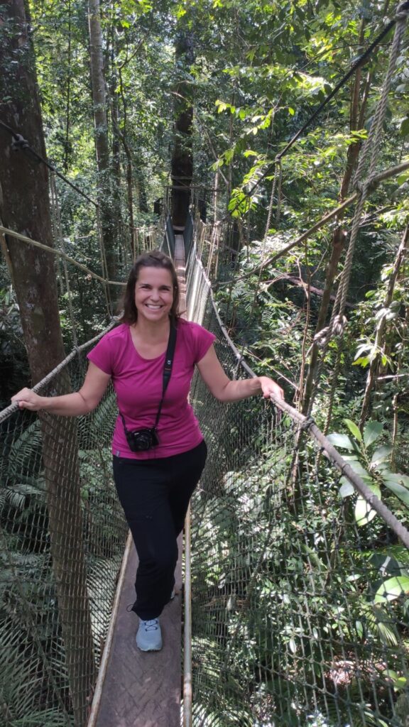 Zu unserer großen Enttäuschung und auch zu unserem Ärger sind leider nahezu alle Wanderwege aufgrund der Regenzeit gesperrt. Ist ja schon okay, die Wege zu sperren – vermutlich kann deren Sicherheit in der Regenzeit nicht zwingend gewährleistet werden – es wäre aber doch schön gewesen, etwas davon auf der ansonsten durchaus professionellen Homepage des Nationalparkes zu erfahren. Dort wird aber wie eh und je mit einem gigantischen Netz an Tracks einschließlich Mehrtagestouren geworben. Für uns bleibt unterm Strich nur der sogenannte Canopy-Walk, ein Weg über Hängebrücken in den Baumwipfeln, sowie ein vergleichsweise kurzer Rundweg übrig – den wir dann aber auf eigene Faust über abenteuerliche Pfade mehr oder weniger absichtlich deutlich erweitern 😉